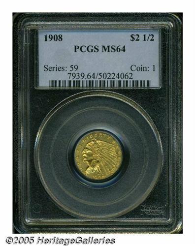 <B>1908<$2 1/2> MS64 PCGS.</B></I> Typically defined with smooth satiny luster and no obvious marks on either side. A splendid type coin and always a popular date because of the first year of type status.