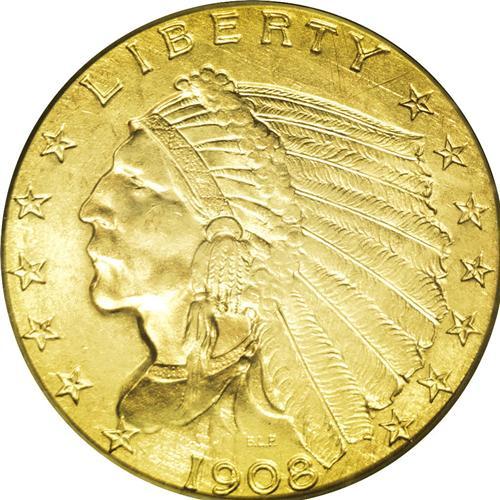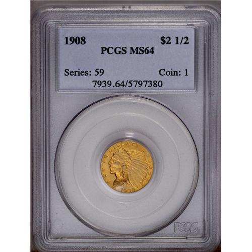 <B>1908<$2 1/2> MS64 PCGS.</B></I> Typically struck for this popular first-year issue, the definition is bold in virtually all areas, save for the eagle's wingtip. Both sides are rich gold in color with no mentionable bagmarks. A curious area of steel-gray discoloration at the base of the obverse partially obscures a group of slidemarks.