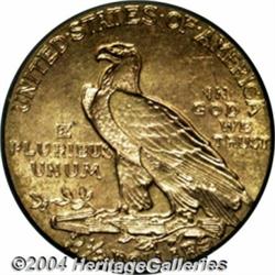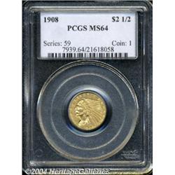 <B>1908<$2 1/2> MS64 PCGS.</B></I> A boldly struck and shimmering straw-gold near-Gem. Unimportant marks are encountered on the Y in LIBERTY and the N in IN, but the surfaces are generally well preserved. The first year of this popular type, from the only pre-1933 gold series that can be readily completed by date and mintmark. <BR><BR><B>Important notice:</B> Heritage usually auctions material at the rate of 200-250 lots per hour. On some occasions eBay Live bid software or the Internet may not be able to keep up with the pace of the auction. We recommend placing a realistic absentee bid now as insurance to avoid disappointment. Occasionally the auctioneer may eliminate or reject an eBay Live bid, and the auctioneer may also reopen a lot after the close of the eBay live bidding (usually because we missed an audience bid), and may reject your bid even if it shows you as the winning bidder. By bidding via eBay Live, you agree that Heritage may award the lot to another bidder at its sole discretion under the circumstances described above or any other reasonable circumstances. Since eBay bids are not shown to us until we open the lot on the floor, we treat those bids just like floor bids. In most cases the floor responds before the eBay bid is presented to us, due to Internet lag time, so for consistency we have made it a policy that floor bids are always considered first over tie eBay live bids. Also please note that all Heritage lots purchased through eBay Live carry a 20% Buyer's Premium. Please make sure you read the Terms and Conditions before you bid. </span></font></tr></table></td></tr></table>