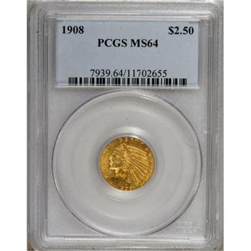 <B>1908 $2 1/2 MS64 PCGS.</B></I> Both sides of this solidly struck first-year Pratt quarter eagle offer vibrant luster, and the sun-gold surfaces show only inconsequential marks. Choice and highly appealing.<BR><BR><B>Coin Engraver:</B> Bela Lyon Pratt<BR><BR><b>Shipping:</b> Coins & Currency (<a target="_blank" href="http://www.heritageauctions.com/common/shipping.php">view shipping information</a>)