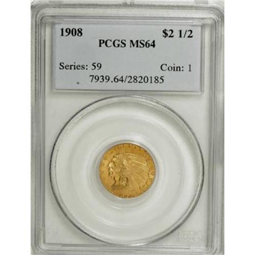 <B>1908 $2 1/2 MS64 PCGS.</B></I> This is a highly attractive first-year example of the Indian Head quarter eagle. The piece displays bold luster and unusually deep lime-gold coloration. A couple of minute marks in the left obverse field limit the grade. <BR><BR><B>Coin Engraver:</B> Bela Lyon Pratt<BR><BR><b>Shipping:</b> Coins & Currency (<a target="_blank" href="http://www.heritageauctions.com/common/shipping.php">view shipping information</a>)