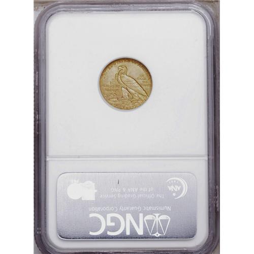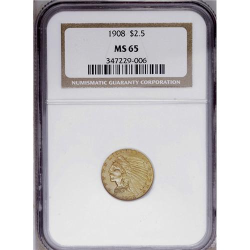 <B>1908<$2 1/2> MS65 NGC.</B></I> Lime and peach tones interchange throughout this original and impressively preserved first-year Gem. Only a couple of inconsequential ticks on the portrait preclude a finer designation. The strike is exquisite aside from the customary minor incompleteness on the lowest headdress feathers.