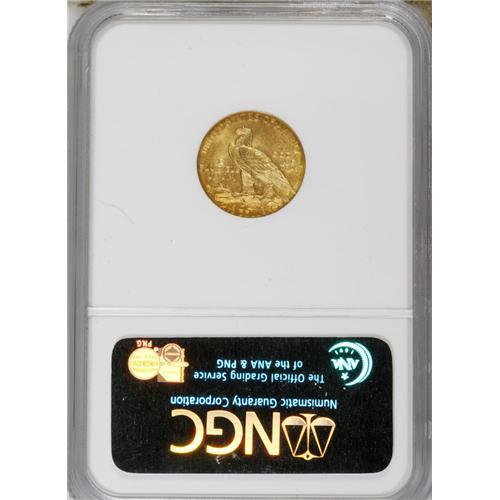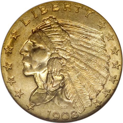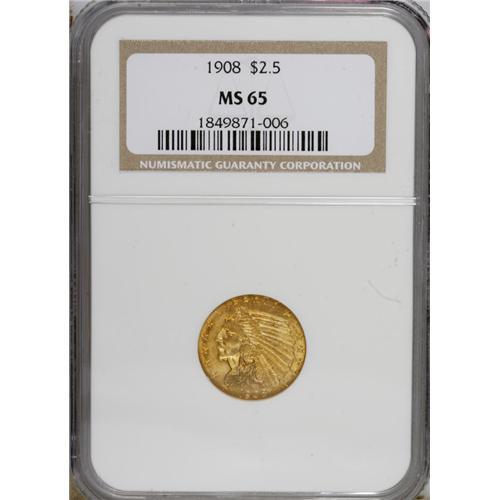 <B>1908 $2 1/2 MS65 NGC.</B></I> Though many individuals were quick to condemn Pratt's gold designs when they debuted in 1908, their novelty was immediately apparent, and wealthy collectors saved numerous examples. Every facet of this Gem showcases nearly a century of care. The well-defined devices have hardly any marks, and the subtly luminous obverse gives way to the yellow-gold reverse, which has potent luster. A single carbon spot is noted at the top of the eagle's head.<BR><BR><b>Shipping:</b> Coins & Currency (<a target="_blank" href="http://www.heritageauctions.com/common/shipping.php">view shipping information</a>)