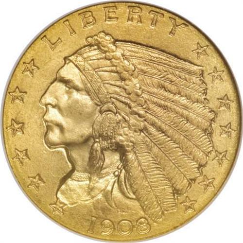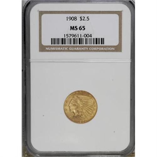 <B>1908 $2 1/2 MS65 NGC.</B></I> A stunning Gem with frosty gold luster and exceptional design definition. First year of issue coins are always popular with type collectors, and the mintage of this issue was enough to ensure that everyone can own an example. Relatively few finer pieces are certified, including just 56 at NGC.<BR><BR><B>Coin Engraver:</B> Bela Lyon Pratt<BR><BR><b>Shipping:</b> Coins & Currency (<a target="_blank" href="http://www.heritageauctions.com/common/shipping.php">view shipping information</a>)