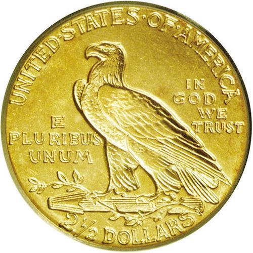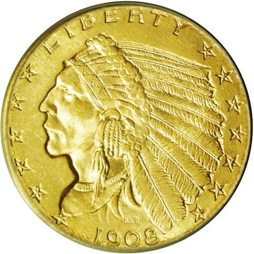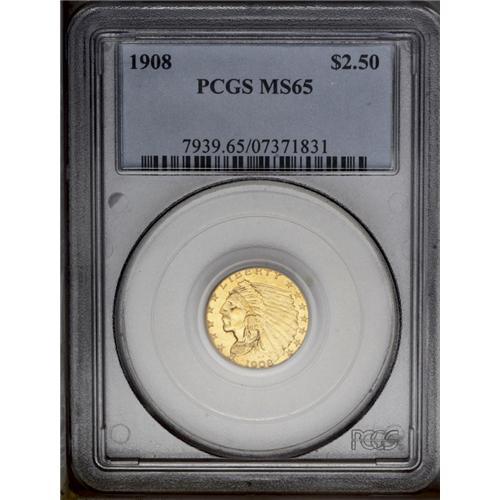 <B>1908<$2 1/2> MS65 PCGS.</B></I> A fully lustrous Gem example with brilliant yellow surfaces and splashes of light orange color on the reverse. Sharply struck, although the upper wing on the reverse exhibits typical weakness. The present specimen marks the beginning of the Indian Head design created by Bela Lyon Pratt. <BR><BR><B>Important notice:</B> Heritage usually auctions material at the rate of 200-250 lots per hour. On some occasions eBay Live bid software or the Internet may not be able to keep up with the pace of the auction. We recommend placing a realistic absentee bid now as insurance to avoid disappointment. Occasionally the auctioneer may eliminate or reject an eBay Live bid, and the auctioneer may also reopen a lot after the close of the eBay live bidding (usually because we missed an audience bid), and may reject your bid even if it shows you as the winning bidder. By bidding via eBay Live, you agree that Heritage may award the lot to another bidder at its sole discretion under the circumstances described above or any other reasonable circumstances. Since eBay bids are not shown to us until we open the lot on the floor, we treat those bids just like floor bids. In most cases the floor responds before the eBay bid is presented to us, due to Internet lag time, so for consistency we have made it a policy that floor bids are always considered first over tie eBay live bids. Also please note that all Heritage lots purchased through eBay Live carry a 20% Buyer's Premium. Please make sure you read the Terms and Conditions before you bid. This lot is being auctioned in conjunction with a live floor auction by Heritage Galleries & Auctioneers. All final auction and invoice information will be supplied by Heritage Galleries & Auctioneers, and all other information should be considered preliminary. Lot:2466 <BR><BR><B>Winning Notification and Billing:</B> After the FINAL session in this auction is complete, Heritage will send e-mail and snail mail invoices. This process normally takes several days. All final auction and invoice information will be supplied by Heritage Galleries & Auctioneers, and all other information should be considered preliminary. <BR><BR>This auction will be conducted on a live auction floor and over the Internet through eBay Live. If you choose to place an absentee bid, please take a moment to <font color='#0000ff'><u><a href='http://pages.ebay.com/liveauctions/help/before/laabsentee.html'>learn how eBay Live absentee bidding works</a></u></font><font color='#000000'>