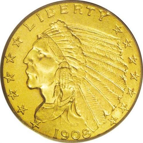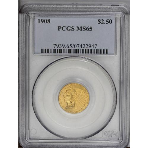 <B>1908<$2 1/2> MS65 PCGS.</B></I> A sharply struck Gem example of Bela Lyon Pratt's Indian Head design, which was first produced in 1908. This example has rich orange-gold color and frosty luster. It is an exceptional example exceeded by few others for overall quality and aesthetic appeal.