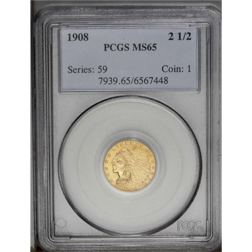 <B>1908 $2 1/2 MS65 PCGS.</B></I> Considerable numbers were saved of this first year of issue, but pieces are always in demand from both type and date collectors. The always-seen weakness on the eagle's wing is a defect in the design rather than a strike problem, one that was corrected on subsequent issues. This lovely antique-gold Gem shows a lack of mentionable abrasions and excellent eye appeal.<BR><BR><b>Shipping:</b> Coin/Currency (<a target="_blank" href="http://www.heritageauctions.com/common/shipping.php">view shipping information</a>)