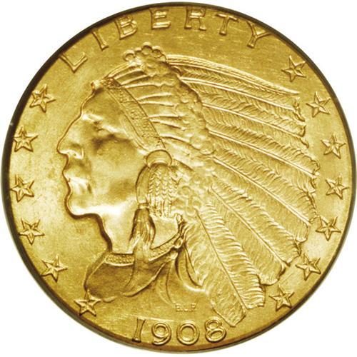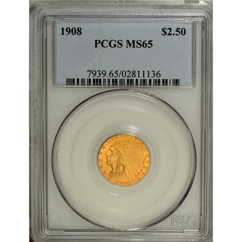 <B>1908 $2 1/2 MS65 PCGS.</B></I> Even with the natural inclination to save the first issue of a new design, which was dampened by a lack of enthusiasm for the experimental stylings of Pratt, Gem examples of this issue are elusive. This quarter eagle is suitably impressed and has a touch of lavender in the otherwise yellow-orange fields. Satiny and attractive with only a handful of trivial marks.<BR><BR><b>Shipping:</b> Coin/Currency (<a target="_blank" href="http://www.heritageauctions.com/common/shipping.php">view shipping information</a>)