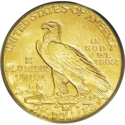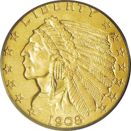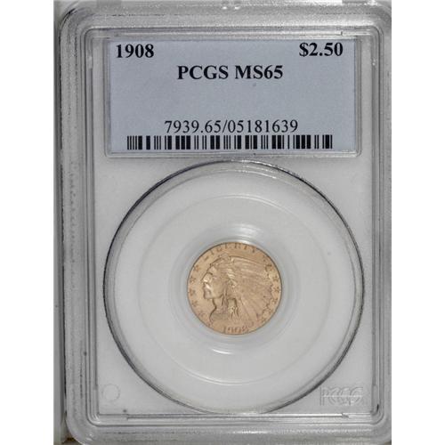 <B>1908<$2 1/2> MS65 PCGS.</B></I> Generally not available in Gem condition, we have multiple high grade examples of the 1908 in this auction. What probably catches the viewer's attention first about this coin is the rich, even red coloration spread over each side. This color is enlivened by the soft, frosted luster, and there are no obvious or mentionable abrasions on either side.