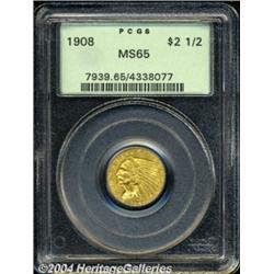 <table><tbody><tr><td><table> <TR><TD width="100%"><TABLE cellSpacing=1 cellPadding=3 width="100%" border=0><TBODY><TR><TD width="100%" bgColor=#79735c><FONT face=arial color=#ffffff size=3><B>Description</B> </FONT></TD></TR><TR><TD width="100%" bgColor=#ffffff><FONT face=arial size=2><B>1908 $2 1/2 MS65 PCGS.</B></I> Sharply defined and showing almost none of the usual numerous, heavy abrasions Indian quarter eagles are so well known for. The softly frosted mint luster is accented by lovely reddish-orange and lilac patina that adds even more to the overall eye appeal of this lovely Gem. </FONT></TD></TR></TBODY></TABLE></TD></TR></TBODY></TABLE><BR><A name=PricesRealized></A><TABLE cellSpacing=0 cellPadding=0 width="100%" bgColor=#000000 border=0><TBODY><TR><TD width="100%"><TABLE cellSpacing=1 cellPadding=3 width="100%" border=0><TBODY><TR><TD width="100%" bgColor=#79735c><A name=PR><FONT face=arial color=#ffffff size=3><B>Previous Prices from Heritage Auctions</B> </FONT></A></TD></TR><TR><TD bgColor=#f6f6ed><TABLE cellSpacing=0 cellPadding=0 width="100%" border=1><TBODY><TR><TD align=middle width="33%"><B>Date</B></TD><TD align=middle width="33%"><B>Service</B></TD><TD align=middle width="33%"><B>Price</B></TD></TR><TR bgColor=whitesmoke><TD width="33%"><B>11/12/2002</B></TD><TD width="33%">NGC</TD><TD width="33%">$2,702.50</TD></TR><TR bgColor=whitesmoke><TD width="33%"><B>01/11/2003</B></TD><TD width="33%">PCGS</TD><TD width="33%">$3,047.50</TD></TR><TR bgColor=whitesmoke><TD width="33%"><B>10/06/2001</B></TD><TD width="33%">PCGS</TD><TD width="33%">$2,673.75</TD></TR><TR bgColor=whitesmoke><TD width="33%"><B>11/17/2000</B></TD><TD width="33%">NGC</TD><TD width="33%">$1,955.00</TD></TR><TR bgColor=whitesmoke><TD width="33%"><B>10/10/1999</B></TD><TD width="33%">PCGS</TD><TD width="33%">$2,300.00</TD></TR><TR bgColor=whitesmoke><TD width="33%"><B>06/04/1999</B></TD><TD width="33%">PCGS</TD><TD width="33%">$2,300.00</TD></TR><TR bgColor=whitesmoke><TD width="33%"><B>06/06/1998</B></TD><TD width="33%">NGC</TD><TD width="33%">$12,075.00</TD></TR><TR bgColor=whitesmoke><TD width="33%"><B>08/17/1996</B></TD><TD width="33%">PCGS</TD><TD width="33%">$4,070.00</TD></TR><TR bgColor=whitesmoke><TD width="33%"><B>12/09/1994</B></TD><TD width="33%">PCGS</TD><TD width="33%">$3,135.00</TD></TR><TR bgColor=whitesmoke><TD width="33%"><B>01/01/2001</B></TD><TD width="33%">PCGS</TD><TD width="33%">$2,300.00</TD></TR><TR bgColor=whitesmoke><TD width="33%"><B>05/01/2001</B></TD><TD width="33%">PCGS</TD><TD width="33%">$2,530.00</TD></TR><TR bgColor=whitesmoke><TD width="33%"><B>02/01/2001</B></TD><TD width="33%">PCGS</TD><TD width="33%">$1,897.00</TD></TR><TR bgColor=whitesmoke><TD width="33%"><B>02/01/2001</B></TD><TD width="33%">PCGS</TD><TD width="33%">$1,926.00</TD></TR><TR bgColor=whitesmoke><TD width="33%"><B>04/01/2001</B></TD><TD width="33%">PCGS</TD><TD width="33%">$2,416.00</TD></TR><TR bgColor=whitesmoke><TD width="33%"><B>03/01/2000</B></TD><TD width="33%">PCGS</TD><TD width="33%">$1,840.00</TD></TR><TR bgColor=whitesmoke><TD width="33%"><B>01/01/1990</B></TD><TD width="33%">PCGS</TD><TD width="33%">$8,800.00</TD></TR><TR bgColor=whitesmoke><TD width="33%"><B>10/01/1990</B></TD><TD width="33%">PCGS</TD><TD width="33%">$5,775.00</TD></TR><TR bgColor=whitesmoke><TD width="33%"><B>12/01/1997</B></TD><TD width="33%">PCGS</TD><TD width="33%">$4,125.00</TD></TR><TR bgColor=whitesmoke><TD width="33%"><B>05/01/1994</B></TD><TD width="33%">PCGS</TD><TD width="33%">$3,575.00</TD></TR><TR bgColor=whitesmoke><TD width="33%"><B>02/01/1997</B></TD><TD width="33%">PCGS</TD><TD width="33%">$2,860.00</TD></TR><TR bgColor=whitesmoke><TD width="33%"><B>11/01/1999</B></TD><TD width="33%">PCGS</TD><TD width="33%">$3,300.00</TD></TR><TR bgColor=whitesmoke><TD width="33%"><B>02/01/2000</B></TD><TD width="33%">NGC</TD><TD width="33%">$1,955.00</TD></TR></TBODY></TABLE></TD></TR><TR><TD bgColor=#ffffff><FONT face=arial size=1 ?>PLEASE NOTE: All prices realized reflect the final hammer price PLUS the buyer's premium in auctions that charge a buyer's premium. Each item has a notation at the top of the listing indicating whether that lot included a buyer's premium. Example: A item that sells with a final hammer price of $100 and a 20% buyer's premium will display with a price realized of $120. All information listed is intended to be as accurate as possible, but errors are possible. Please use this guide carefully and inform us of any inaccuracies. </FONT></TD></TR></TBODY></TABLE></TD></TR></TBODY></TABLE><BR><TABLE cellSpacing=0 cellPadding=0 width="100%" bgColor=#000000 border=0><TBODY><TR><TD width="100%"><TABLE cellSpacing=1 cellPadding=3 width="100%" border=0><TBODY><TR><TD width="100%" bgColor=#79735c colSpan=6><FONT face=arial color=#ffffff size=3><B>Price Guide*</B> </FONT></TD></TR><TR bgColor=#f6f6ed><TD align=middle><B>Grade</B> </TD><TD align=middle><B>Coin World<BR>(Trends)</B> </TD><TD align=middle><B>Numismedia<BR>Retail</B> </TD><TD align=middle><B>Numismedia<BR>Wholesale</B> </TD><TD align=middle><B>Coin<BR>Universe</B> </TD><TD align=middle><B>Heritage<BR>Value Index</B> </TD></TR><TR bgColor=#ffffff><TD align=middle>64</TD><TD align=right>$2,000.00</TD><TD align=right>---</TD><TD align=right>$1,350.00</TD><TD align=right>$1,950.00</TD><TD align=right>$1,392.50</TD></TR><TR style="FONT-WEIGHT: bold" bgColor=#cccfdd><TD align=middle>65</TD><TD align=right>$5,500.00</TD><TD align=right>---</TD><TD align=right>$3,725.00</TD><TD align=right>$5,850.00</TD><TD align=right>$3,876.25</TD></TR><TR bgColor=#ffffff><TD align=middle>66</TD><TD align=right>$7,000.00</TD><TD align=right>---</TD><TD align=right>$5,975.00</TD><TD align=right>$10,500.00</TD><TD align=right>$7,320.00</TD></TR><TR bgColor=#ffffff><TD colSpan=6><FONT size=1>*All information listed is intended to be as accurate as possible, but errors are possible. No item may be returned or refused based on this information which is provided as a serv