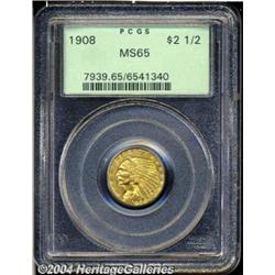 <B>1908<$2 1/2> MS65 PCGS.</B></I> First year of issue and always a favorite of collectors as such. This piece has sparkling, lustrous surfaces and a light accent of orange patina on each side. A few small marks are detected in the field above the eagle on the reverse. <BR><BR><B>Important notice:</B> Heritage usually auctions material at the rate of 200-250 lots per hour. On some occasions eBay Live bid software or the Internet may not be able to keep up with the pace of the auction. We recommend placing a realistic absentee bid now as insurance to avoid disappointment. Occasionally the auctioneer may eliminate or reject an eBay Live bid, and the auctioneer may also reopen a lot after the close of the eBay live bidding (usually because we missed an audience bid), and may reject your bid even if it shows you as the winning bidder. By bidding via eBay Live, you agree that Heritage may award the lot to another bidder at its sole discretion under the circumstances described above or any other reasonable circumstances. Since eBay bids are not shown to us until we open the lot on the floor, we treat those bids just like floor bids. In most cases the floor responds before the eBay bid is presented to us, due to Internet lag time, so for consistency we have made it a policy that floor bids are always considered first over tie eBay live bids. Also please note that all Heritage lots purchased through eBay Live carry a 20% Buyer's Premium. Please make sure you read the Terms and Conditions before you bid.