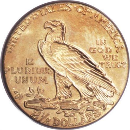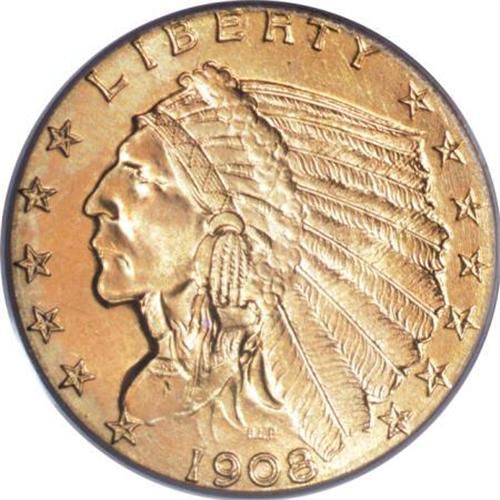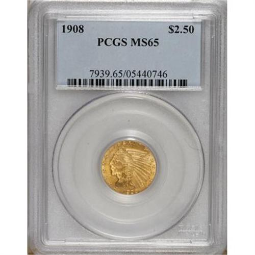 <B>1908 $2 1/2 MS65 PCGS.</B></I> Though a certain number of 1908 quarter eagles were saved for their novelty value, the negative initial public reaction limited that figure, and though examples through near-Gem are available for a price, Gems and better appear on the market with less frequency. This attractive example has a largely wheat-gold obverse and an orange-gold reverse. The devices are well-defined, and the fields have pleasing, shimmering luster.<BR><BR><b>Shipping:</b> Coins & Currency (<a target="_blank" href="http://www.heritageauctions.com/common/shipping.php">view shipping information</a>)