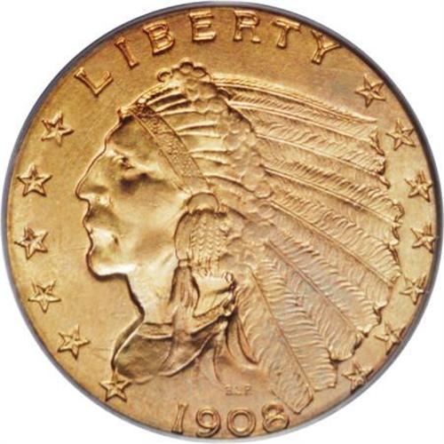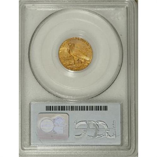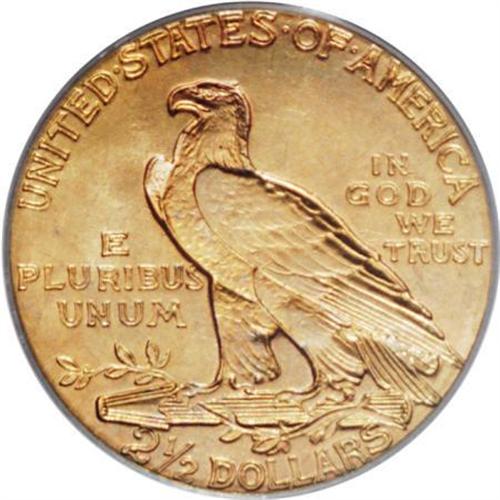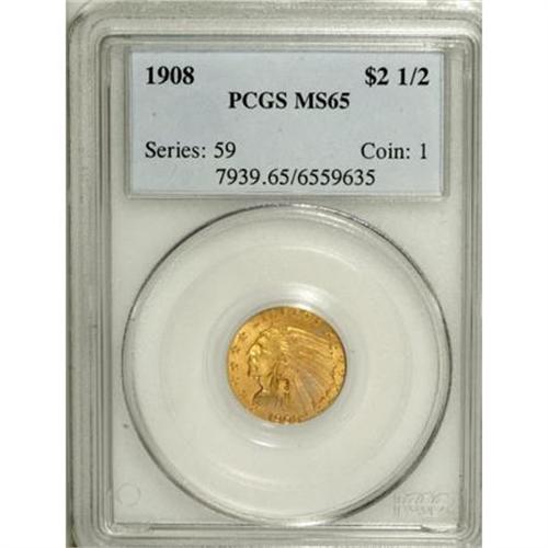 <B>1908 $2 1/2 MS65 PCGS.</B></I> Ice-blue and lilac tints visit this primarily apricot-gold Gem. Luster dominates the beautifully unperturbed fields and devices. The strike is exacting, even within the recesses of the headdress. When Bela Lyon Pratt's incused relief types were introduced, noted numismatist S.H. Chapman complained that the design was unhygienic, arguing that germs might lurk within the sunken elements.<BR><BR><b>Shipping:</b> Coins & Currency (<a target="_blank" href="http://www.heritageauctions.com/common/shipping.php">view shipping information</a>)