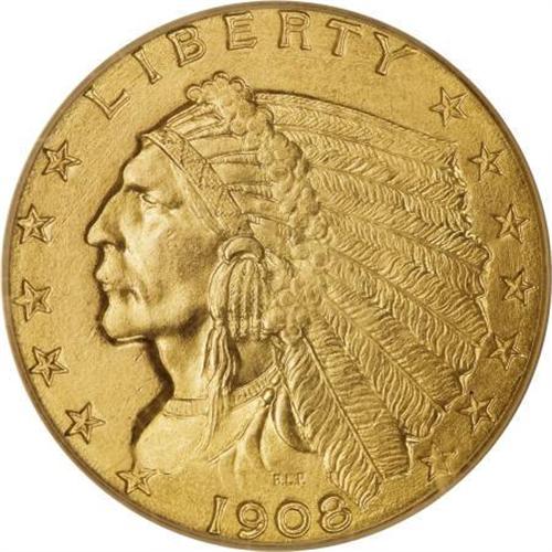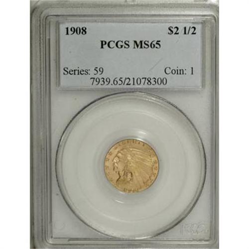 <B>1908 $2 1/2 MS65 PCGS.</B></I> This sharply struck Gem offers excellent detail on the Indian's headdress, and only a hint of weakness of strike on the shoulder of the eagle. The lustrous surfaces show tan, mint-green, and orange patina, and the few light marks that are present do not distract. A popular coin as the first year of issue of the new Indian Head design.<BR><BR><B>Coin Engraver:</B> Bela Lyon Pratt<BR><BR><b>Shipping:</b> Coins & Currency (<a target="_blank" href="http://www.heritageauctions.com/common/shipping.php">view shipping information</a>\)