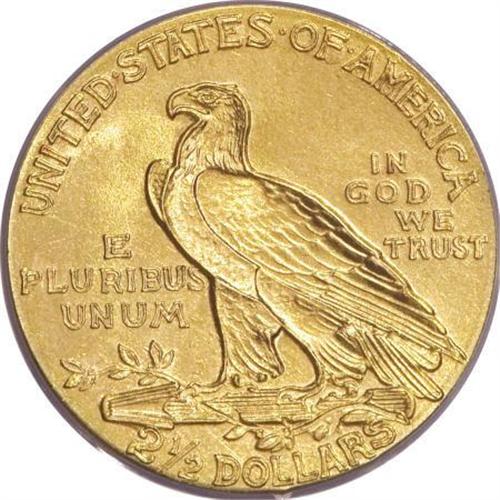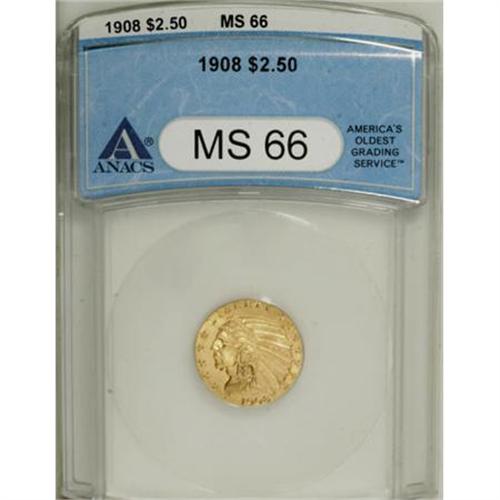 <B>1908 $2 1/2 MS66 ANACS.</B></I> A crisply struck and shining yellow-gold representative that offers excellent eye appeal and lovely luster. The surfaces are practically mark-free on this coin, which hails from the debut year of the Pratt design. The only MS66 listed in the ANACS database, with none finer certified by that service (7/07).<BR><BR><B>Coin Engraver:</B> Bela Lyon Pratt<BR><BR><b>Shipping:</b> Coins & Currency (<a target="_blank" href="http://www.heritageauctions.com/common/shipping.php">view shipping information</a>\)