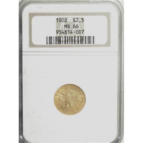 <B>1908 $2 1/2 MS66 NGC.</B></I> A captivating exemplar of this first-year type, with central accents of greenish-gold melding into orange-gold at the peripheries. The highpoints of the Indian's cheek and indeed the entire surfaces are pristine and abrasion-free. Just trifling strike weakness is noted on the eagle's forward wingtip. Census: 54 in 66, 3 finer (12/07).<BR><BR><B>Coin Engraver:</B> Bela Lyon Pratt<BR><BR><b>Shipping:</b> Coins & Currency (<a target="_blank" href="http://www.heritageauctions.com/common/shipping.php">view shipping information</a>)