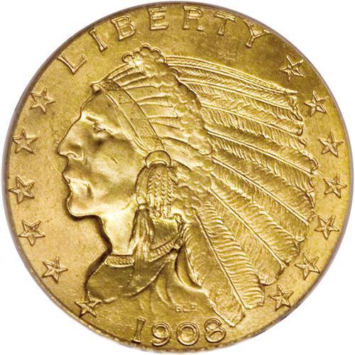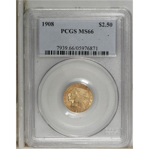 <B>1908 $2 1/2 MS66 PCGS.</B></I> This is an amazing example of the first Indian quarter eagle issue, approaching the finest quality that has ever been certified. Both sides are frosty and fully lustrous with intermingled yellow and rose color. The combination of a first year issue and exceptional quality will prove difficult to beat. Population: 77 in 66, 2 finer (3/07).<BR><BR><b>Shipping:</b> Coins & Currency (<a target="_blank" href="http://www.heritageauctions.com/common/shipping.php">view shipping information</a>)