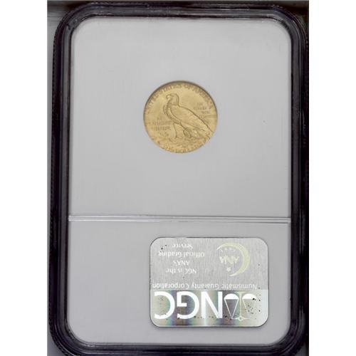 <B>1908<$2 1/2> MS67 NGC.</B></I> Bela Lyon Pratt's quarter eagle and half eagle avoided the motto controversy that swept the recently introduced Saint-Gaudens gold types. But Pratt's novel recessed relief design had its naysayers, who thought that germs would accumulate within the devices. However, the principal numismatic difference between the Indian quarter eagle and its Liberty predecessor is that high grades for the former are more difficult to obtain. This is because the fields are the highpoints of the design, and are unprotected from abrasions. This crisply struck khaki-gold Superb Gem provides an exception, since only the most trivial contact is detected. The ideal candidate for the collector assembling the highest quality type set composed solely of pieces from the first year of the design. NGC and PCGS combined have certified a mere five pieces at the MS67 level, and none at either service have achieved a finer grade (9/06).