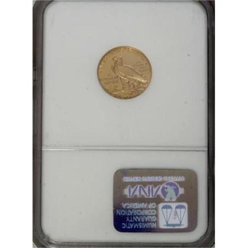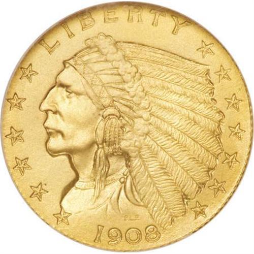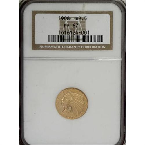 <B>1908 $2 1/2 PR67 NGC.</B></I> The mintage for proof 1908 quarter eagles was a hefty 236 pieces, highest of the series except for the suspiciously large 1910 output. As Breen pointed out, "nearly complete knife-rims on both sides," a diagnostic easily seen on this piece even within the encasement. It seems that a larger percentage of the new matte finish proofs were saved as novelties than previous or subsequent years. This piece displays lovely matte surfaces with thousands of tiny, sparkling facets over the surfaces. A virtually perfect proof with even color and a razor-sharp strike. Census: 23 in 67, 0 finer (1/08).<BR><BR><B>Coin Engraver:</B> Bela Lyon Pratt<BR><BR><b>Shipping:</b> Coins & Currency (<a target="_blank" href="http://www.heritageauctions.com/common/shipping.php">view shipping information</a>)