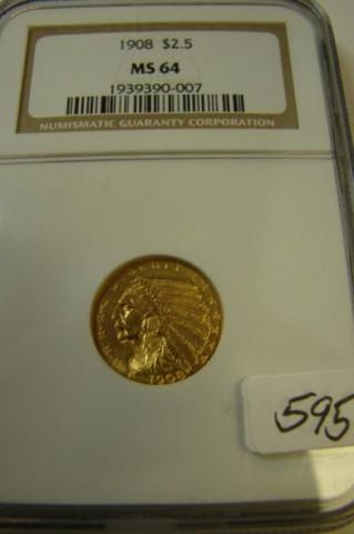 1908 $2.50 Indian Head Gold Coin NGC MS64