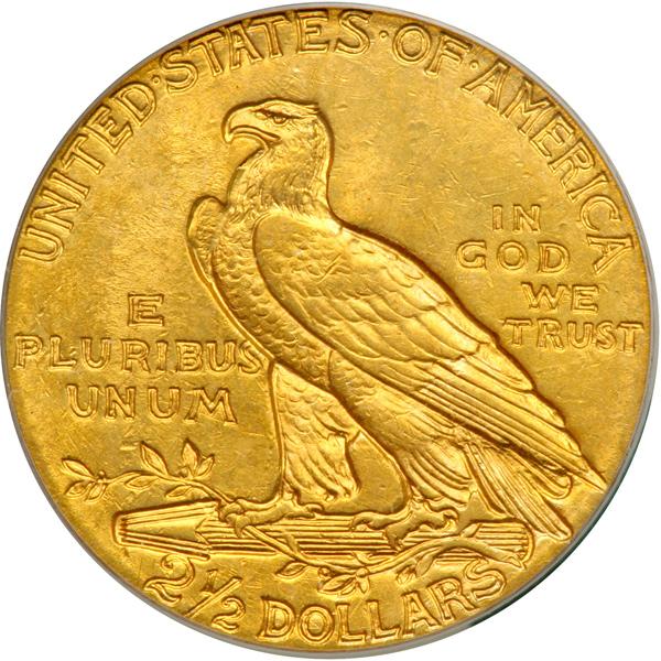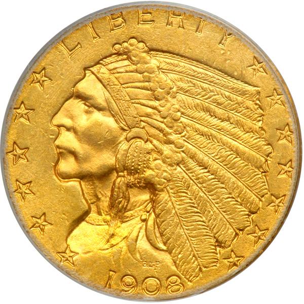 1908 $2.50 Indian. PCGS graded MS-63 PQ. Nice golden toning. An attractive coin. Strikingly lustrous throughout with no deep abrasions present to sidetrack your enjoyment of the smooth surface and bold relief on the Indian and eagle. First year of issue (PCGS # 7939) .
