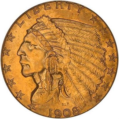 We have handled numerous business strikes or Proofs of this year, some that come as close to perfection as is possible. Both sides of this agreeable and choice MS63 are richly frosted with shimmering gold luster. The strike is complete, or at least as complete as the unique to 1908 hub-die impression can ever be.