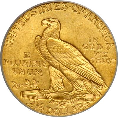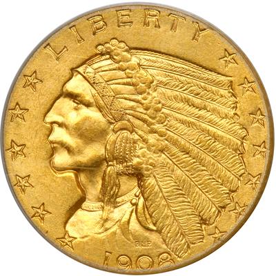 1908 $2.50 Indian. PCGS graded MS-63. Lightly toned. Attractive golden frost from edge to edge (PCGS # 7939).
