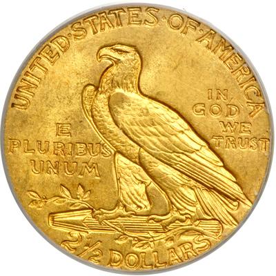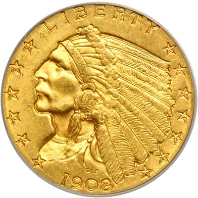 1908 $2.50 Indian. PCGS graded MS-63. Delicate golden toning makes this an attractive Indian quarter eagle (PCGS # 7939).