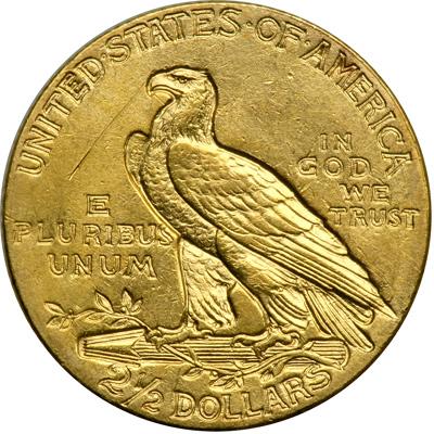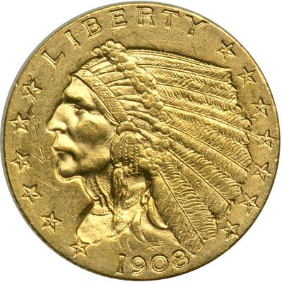 1908 $2.50 Indian. Sharpness of About Uncirculated. We note some scratches.