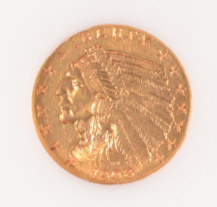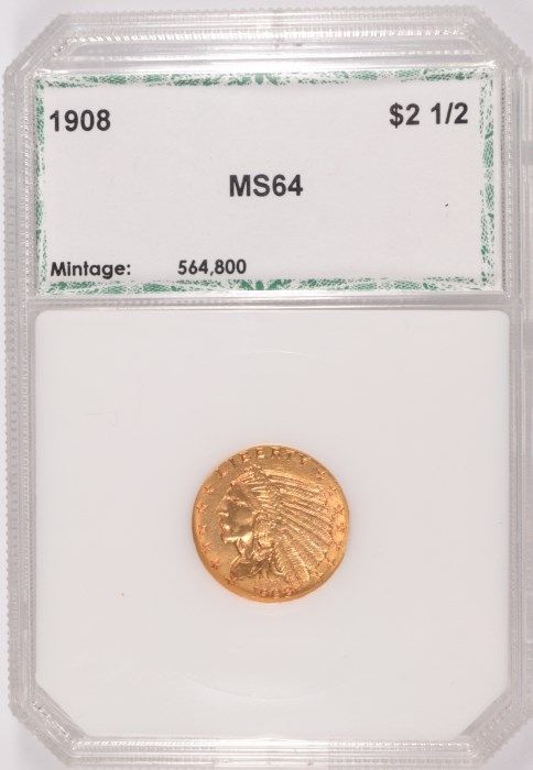 1908 $2.500 INDIAN GOLD, PCI GREEN LABEL MS-64