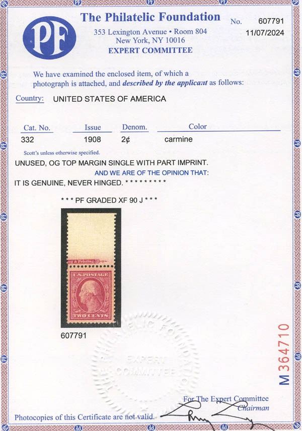 1908, 2¢ Washington, carmine, D.L. watermark. Scott 332. SMQ $85, XF, with 2024 P.F. certificate graded XF 90 J