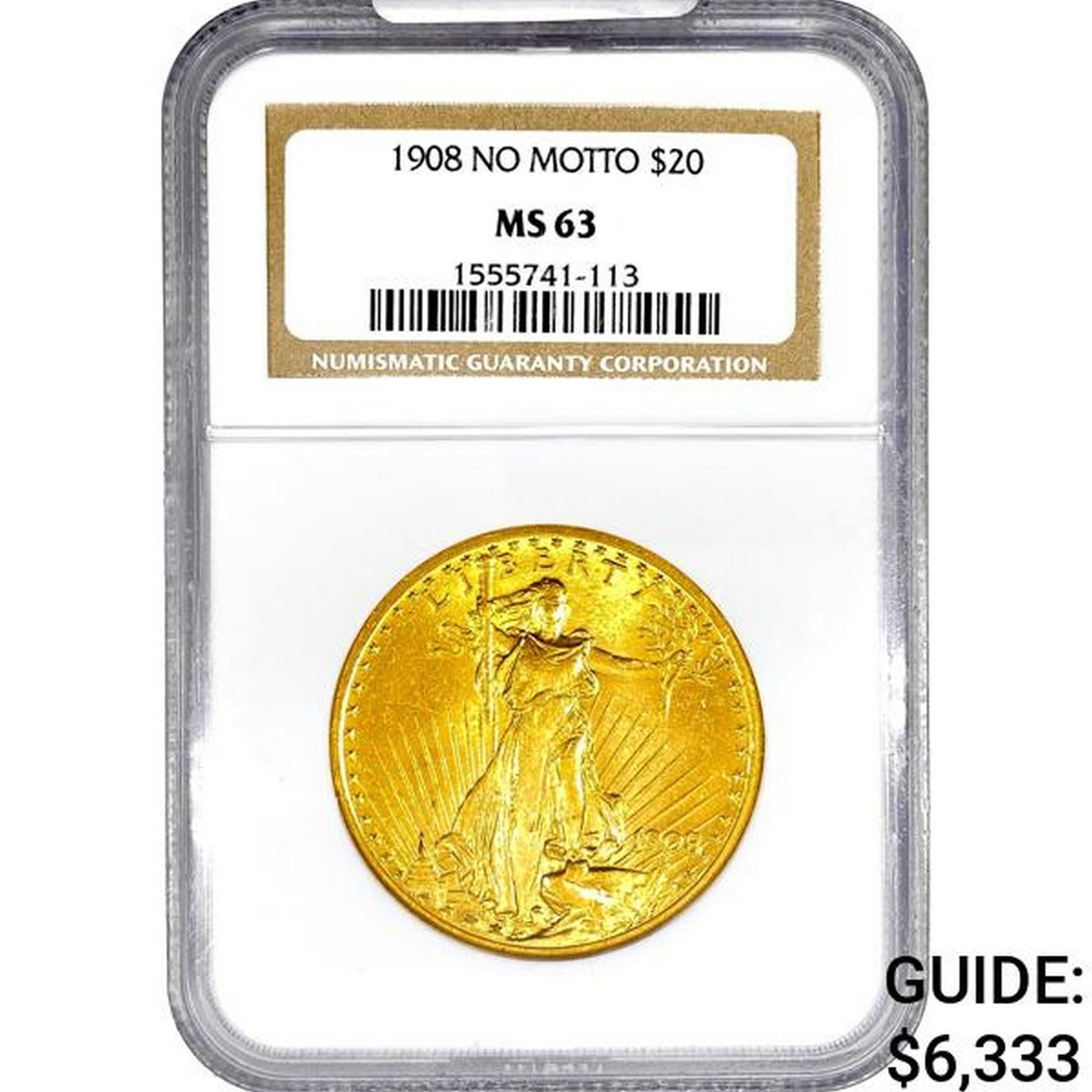 1908 $20 Gold Double Eagle NGC MS63 No Motto