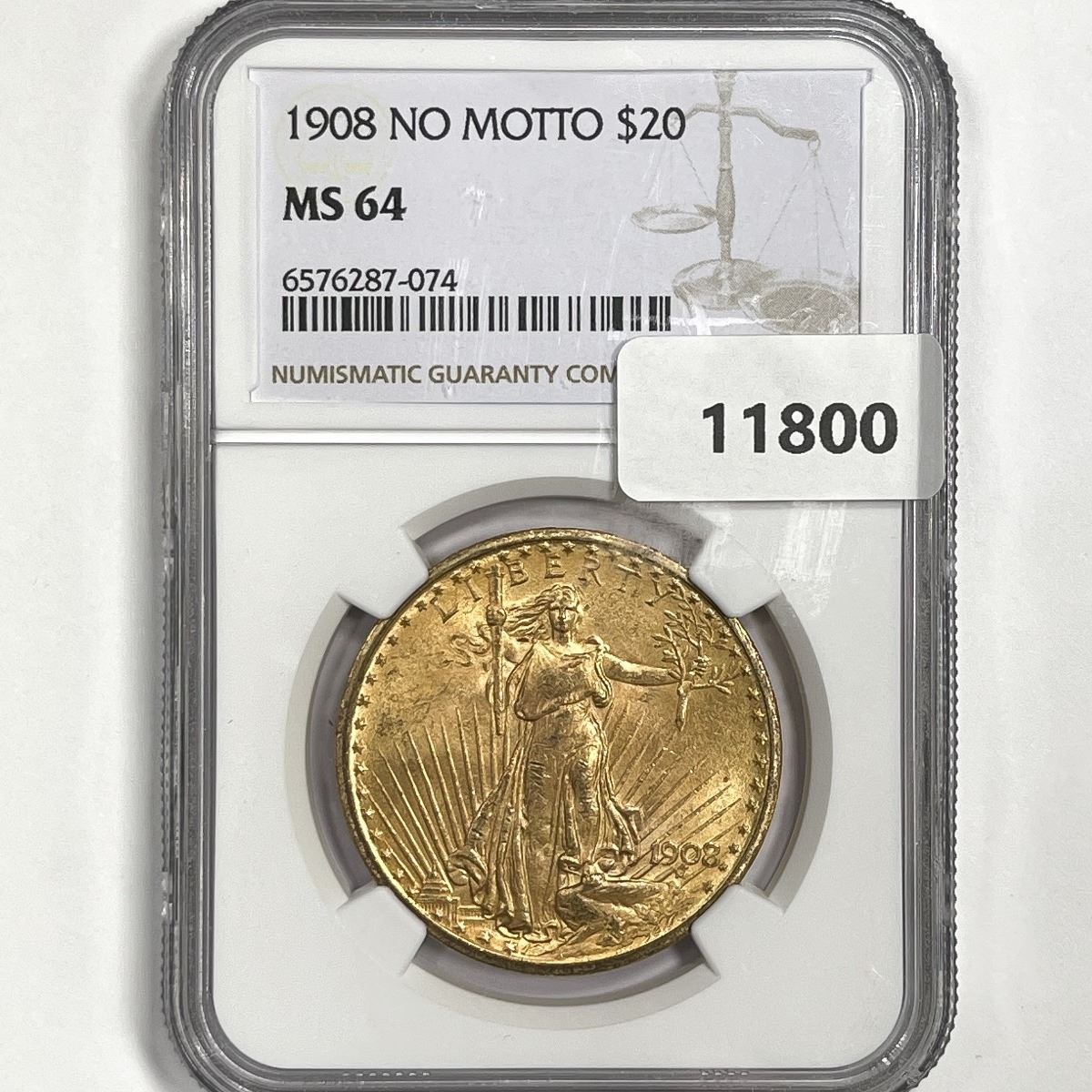 1908 $20 Gold Double Eagle NGC-MS64 No Motto