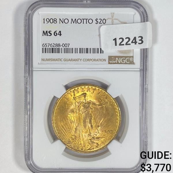 1908 $20 Gold Double Eagle NGC-MS64 No Motto