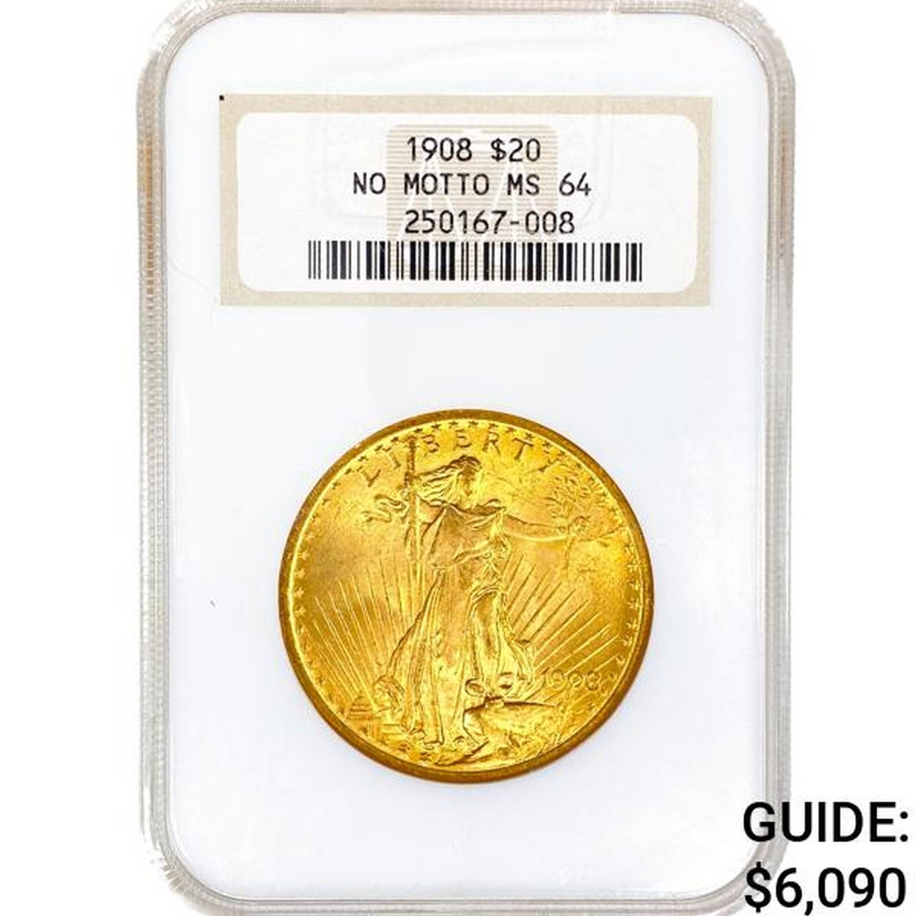 1908 $20 Gold Double Eagle NGC MS64 No Motto