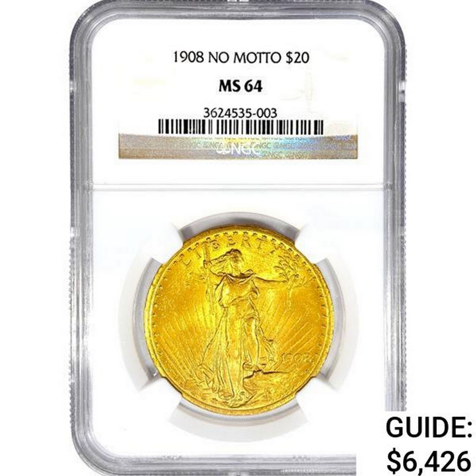 1908 $20 Gold Double Eagle NGC MS64 No Motto