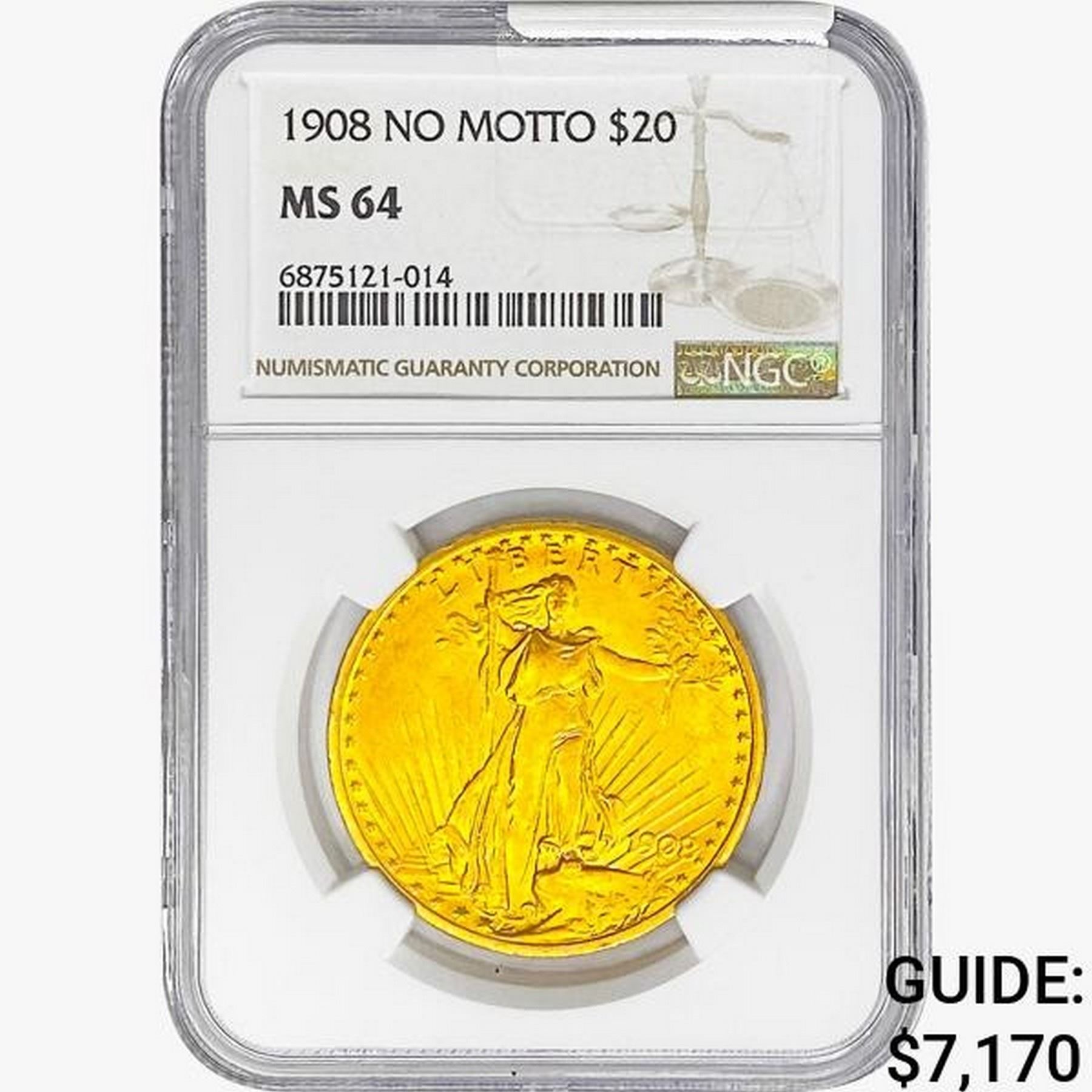 1908 $20 Gold Double Eagle NGC MS64 No Motto
