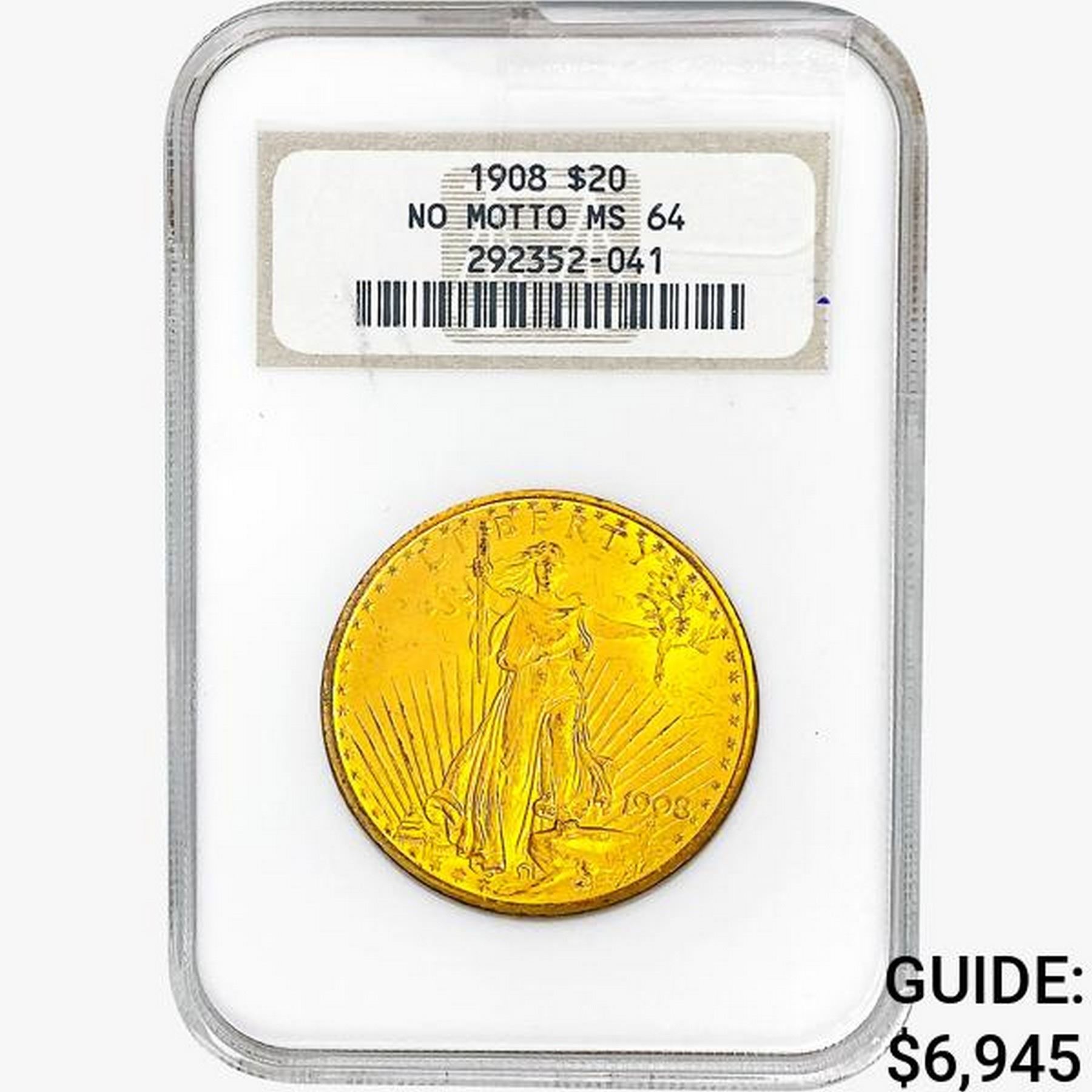 1908 $20 Gold Double Eagle NGC MS64 No Motto