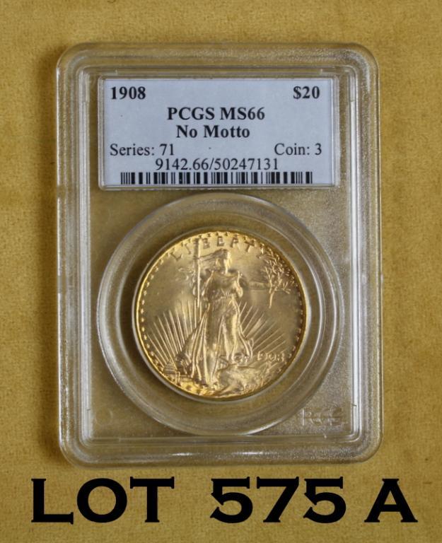 1908 $20 Gold Liberty Coin MS66 No Motto Series: 71 Coin: 3 Est. $2,000-4,000