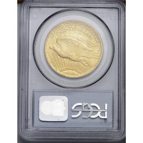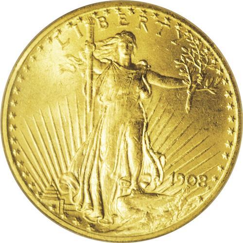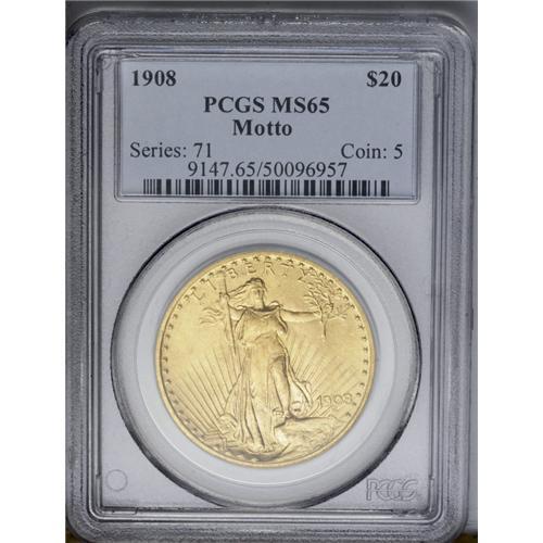 <B>1908<$20> Motto MS65 PCGS.</B></I> The infrequency with which Gem quality 1908 Motto double eagles appear at auction lends even more importance to this particular lot, as we have only sold a handful of MS65 specimens over the past 15 years. Of course, as a low mintage (156,359 pieces) date, the '08 Motto is a desirable coin at all levels of preservation, but considered rare as a Gem. Yellow-gold in cast, the softly frosted features are boldly struck throughout and much sharper in detail than that which is often seen on similarly dated No Motto examples. Just a few wispy abrasions are seen under magnification, but these do not detract from this coin's pleasing overall appearance. Population: 24 in 65, 10 finer (6/06).<BR><I>From The Jackson Hole Collection.</B></I>
