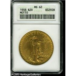 <B>1908 $20 Motto MS62 ANACS.</B></I> Typically struck and satiny, with bold luster, matte-like surface textures, and a small number of scattered, superficial contact marks. Lot:9479