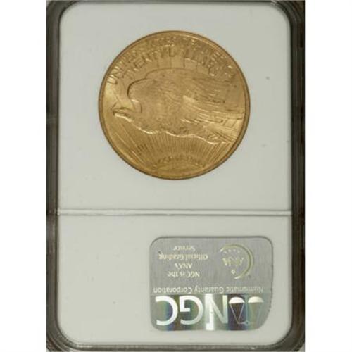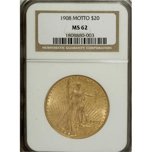 <B>1908 $20 Motto MS62 NGC.</B></I> A well struck and satiny example of the first Philadelphia Motto issue, yellow-orange with slightly hazy fields. The devices and the nearby regions show scattered abrasions and a number of luster grazes.<BR><BR><B>Coin Engraver:</B> Augustus Saint-Gaudens<BR><BR><b>Shipping:</b> Coins & Currency (<a target="_blank" href="http://www.heritageauctions.com/common/shipping.php">view shipping information</a>)