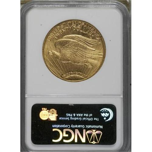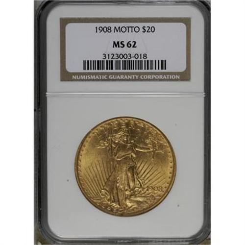 <B>1908 $20 Motto MS62 NGC.</B></I> NGC Census: (616/595). PCGS Population (433/933). Mintage: 156,200. Numismedia Wsl. Price for NGC/PCGS coin in MS62: $1,040. (#9147)<BR><BR><B>Coin Engraver:</B> Augustus Saint-Gaudens<BR><BR><b>Shipping:</b> Coins & Currency (<a target="_blank" href="http://www.heritageauctions.com/common/shipping.php">view shipping information</a>)
