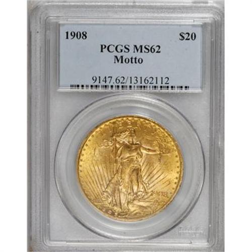 <B>1908 $20 Motto MS62 PCGS.</B></I> Butter-yellow and straw-gold are the dominant hues on this luminous first-year Motto double eagle. Light abrasions and tiny ticks pepper the figure of Liberty and the nearby fields.<BR><BR><B>Coin Engraver:</B> Augustus Saint-Gaudens<BR><BR><b>Shipping:</b> Coins & Currency (<a target="_blank" href="http://www.heritageauctions.com/common/shipping.php">view shipping information</a>)