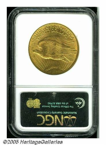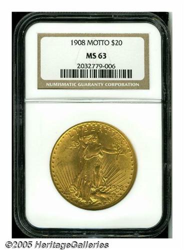 <B>1908<$20> Motto MS63 NGC.</B></I> Boldly struck with matte-like, satiny-frosty surfaces that have pleasing peach and apricot-gold toning, and a few minor abrasions that limit the grade without significantly reducing the overall eye appeal of the piece.