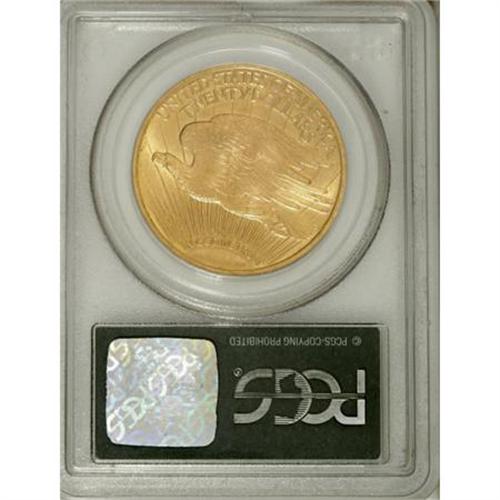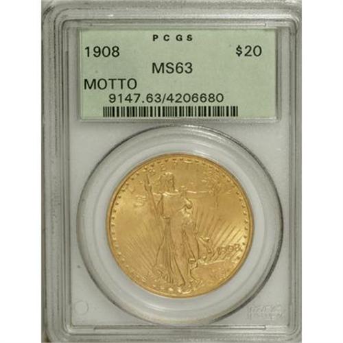 <B>1908 $20 Motto MS63 PCGS.</B></I> A satiny low mintage twenty with rich green-gold and peach toning. The Capitol building is well struck, and there are fewer marks than customary for the grade. Certified in a green label holder.<BR><I>From The Vanek Collection.</B></I><BR><BR><b>Shipping:</b> Coins & Currency (<a target="_blank" href="http://www.heritageauctions.com/common/shipping.php">view shipping information</a>)