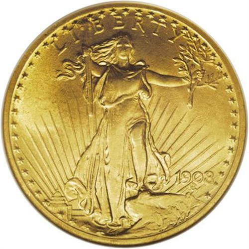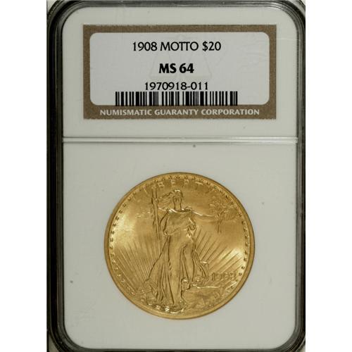 <B>1908 $20 Motto MS64 NGC.</B></I> A significant issue, considerably scarcer than its No Motto counterpart. Its mintage is much lower, and its distribution left no sizable accumulations in the vein of the Wells Fargo hoard. This well struck coin's wheat-gold surfaces are minimally marked for the grade. Choice with pleasing luster, though the surfaces are slightly subdued when compared with similar examples.<BR><I>From The Greg Southward Collection.</B></I><BR><BR><b>Shipping:</b> Coins & Currency (<a target="_blank" href="http://www.heritageauctions.com/common/shipping.php">view shipping information</a>)