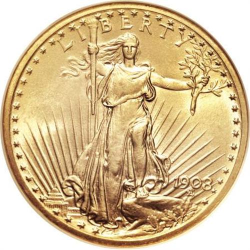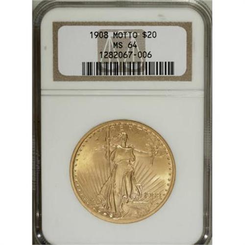 <B>1908 $20 Motto MS64 NGC.</B></I> Although designated only as MS64, the surfaces of this better date twenty are unusually free from scuffs. A lustrous yellow-gold example that may be conservatively graded. The 1908 No Motto is a high mintage issue, but its Motto counterpart was struck in decidedly lesser quantity.<BR><BR><B>Coin Engraver:</B> Augustus Saint-Gaudens<BR><BR><b>Shipping:</b> Coins & Currency (<a target="_blank" href="http://www.heritageauctions.com/common/shipping.php">view shipping information</a>)