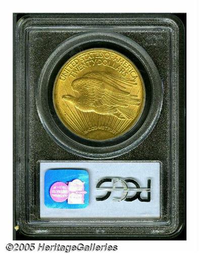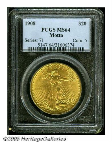 <B>1908<$20> Motto MS64 PCGS.</B></I> A Choice example of this date that retains clean fields and attractive surfaces. The strike is sharp on all but the uppermost devices on Liberty and the eagle. This issue has not turned up in large numbers in high grades, and this is about as nice as one can hope to obtain.