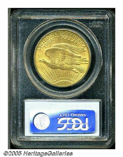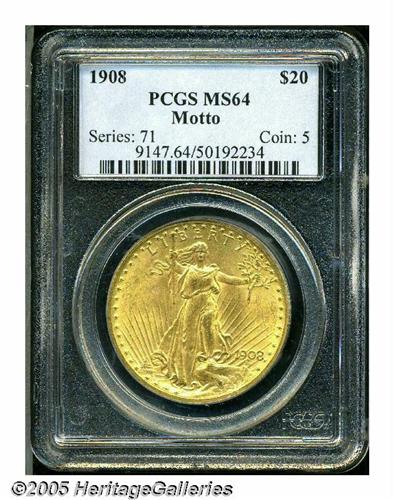 <B>1908<$20> Motto MS64 PCGS.</B></I> Well struck, the rich green-gold coloration has an occasional dab of lilac interspersed over the obverse. A very attractive example of this much scarcer type from 1908, only 214 pieces have been so graded by PCGS with a mere 22 coins in higher condition (3/05).